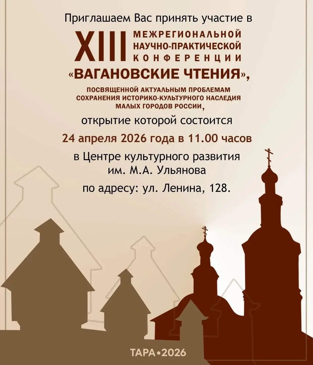 24-25 апреля в Таре пройдет XIII межрегиональная научнопрактическая конференция «Вагановские чтения», посвященная актуальным вопросам сохранения историкокультурного наследия малых городов России.