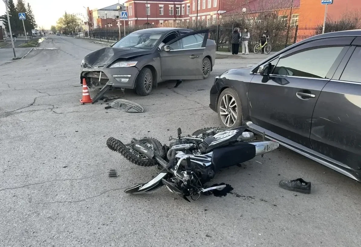Предварительно установлено, что в вечернее время 27 апреля в г. Тюкалинске 38-летний водитель автомобиля «FORD MONDEO» не предоставил преимущество права первого проезда перекрестка улиц Луначарского и Ленина встречному транспорту - кроссовому мотоциклу под управлением 15-летнего подростка. После столкновения мотоцикл с ребенком отбросило на автомобиль "Субару".