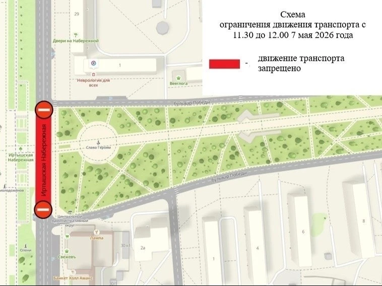 Мероприятие пройдет 7 мая. С 11:30 до 12:00 будет ограничено движение транспортных средств на Иртышской набережной на участке от дома № 1 по бульвару Победы до дома № 30 по Иртышской набережной.
