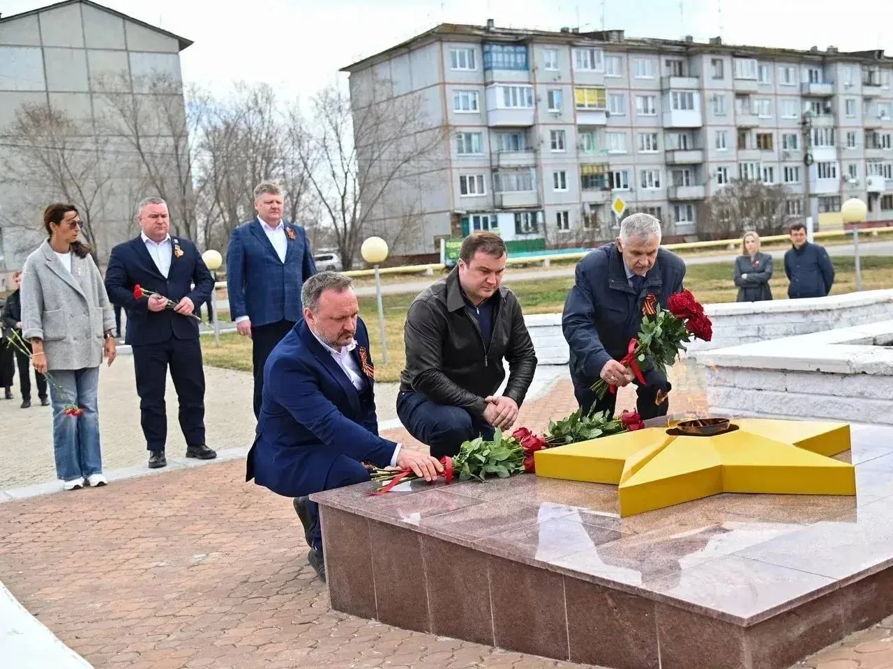 Губернатор вместе с главой Омского района Геннадием Долматовым возложил цветы к Вечному огню мемориального комплекса.