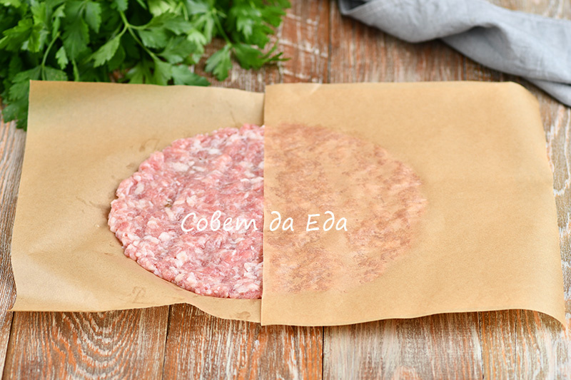 4. Фарш можно использовать любой. Перемешиваем его с солью и перцем, делим на 2 части и формируем шарики. На заранее подготовленный пергамент выкладываются шарики фарша, которые затем быстро расплющиваются в плоские лепешки.
