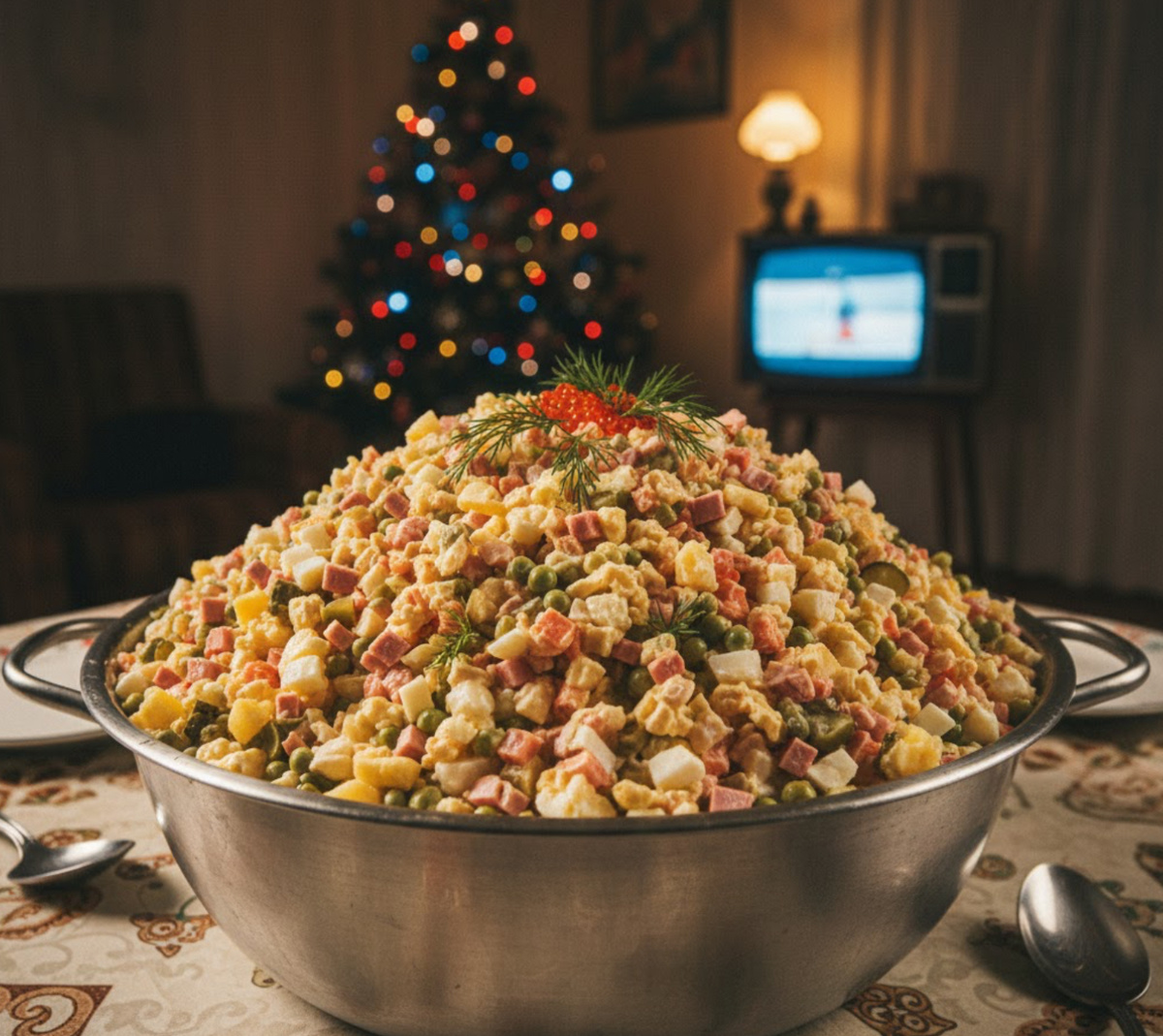 Праздничные блюда в советской кухне обладали важной функцией — создавать атмосферу достатка и уверенности. Оливье отлично справляется с этой задачей благодаря своему: