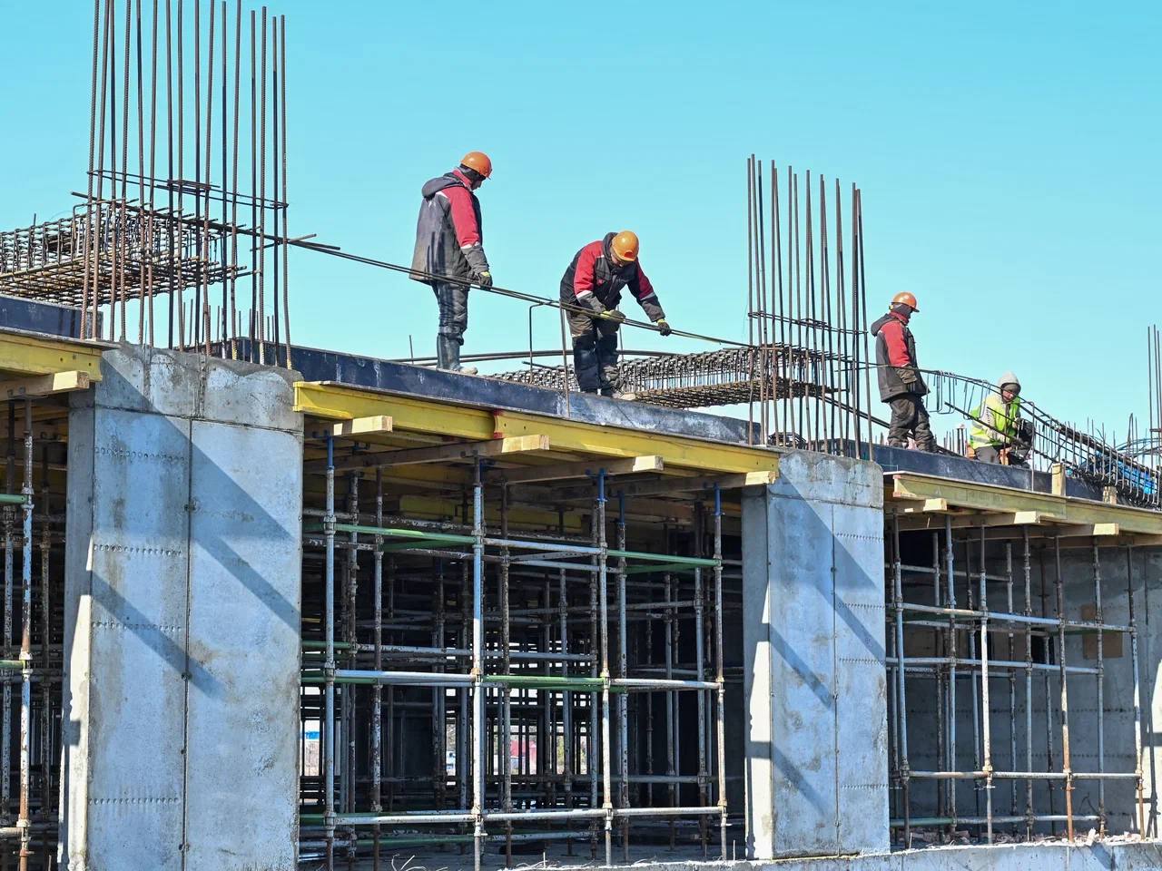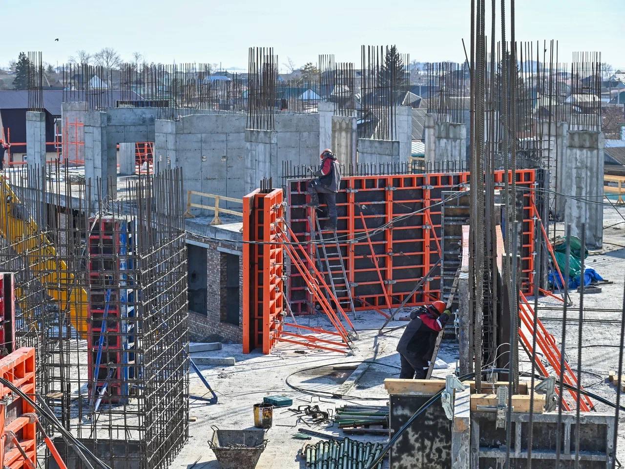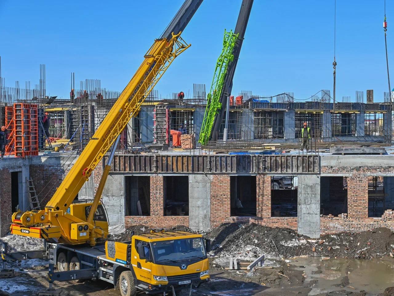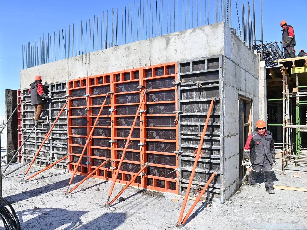 Подрядчик сохраняет хорошие темпы строительства школы на 550 учеников в селе Одесское. На площадке достаточно строителей и техники. Все работы ведутся по графику.