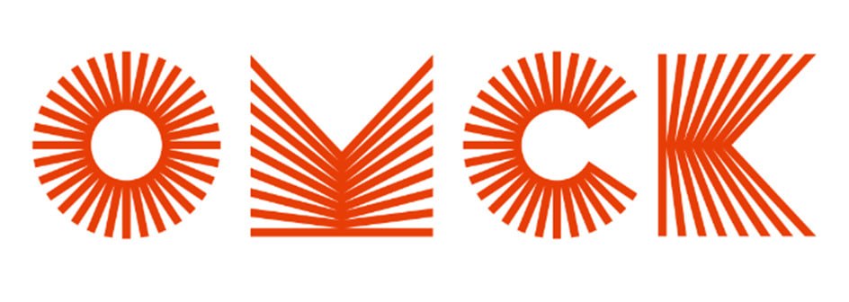 Это графическое написание слова «Омск» в оранжевой гамме, где буквы стилизованы под расходящиеся лучи