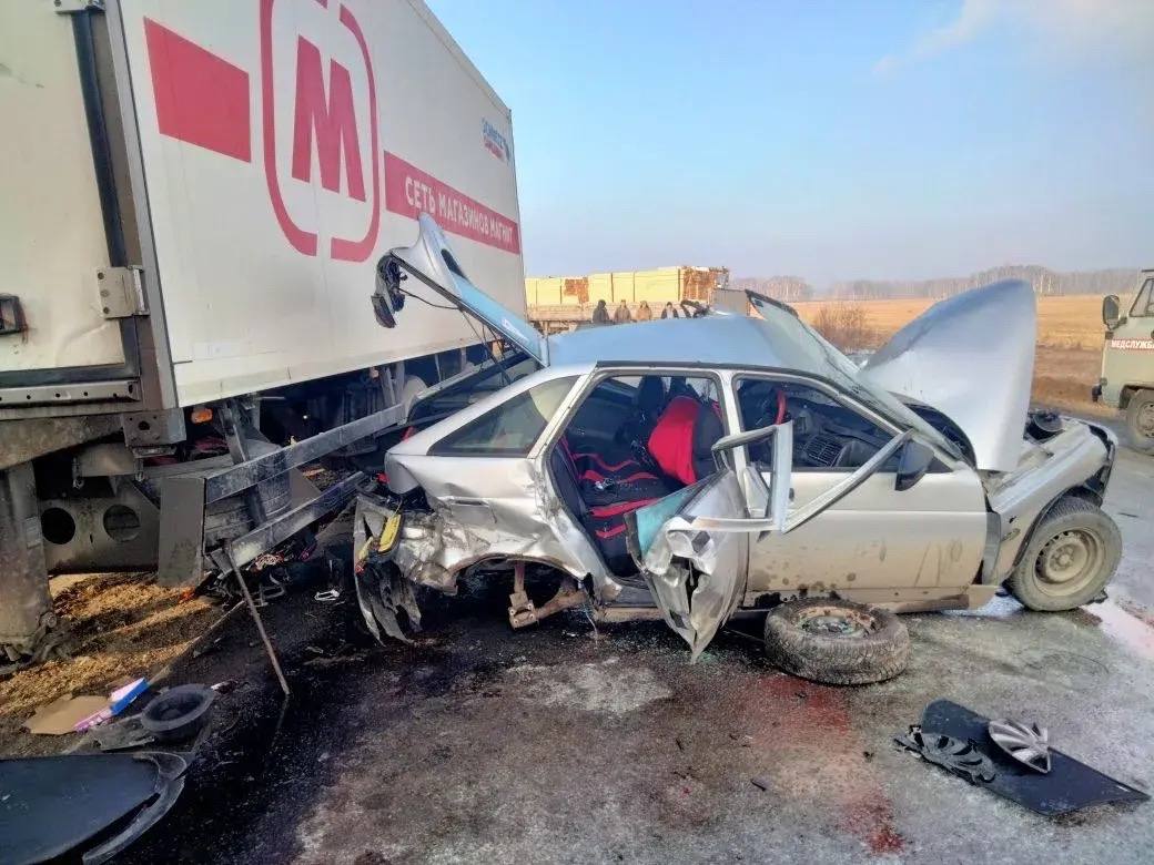Сегодня утром, около 07:30, на 68 км автодороги Омск — Тара произошло серьёзное ДТП. По предварительным данным, водитель ВАЗ-2112 выехал на встречную полосу и столкнулся с двумя большегрузами — Freightliner и MAN.