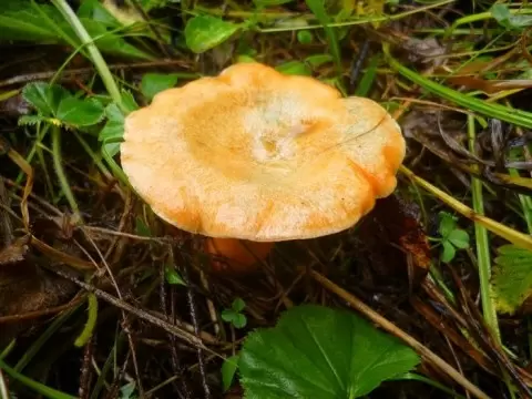 - Внешний вид: Шляпка в молодом возрасте бывает почти плоской, а по мере роста принимает форму воронки, причем на поверхности заметны концентрические кольца. Цвет шляпки варьируется от красновато-оранжевого до зеленоватого.