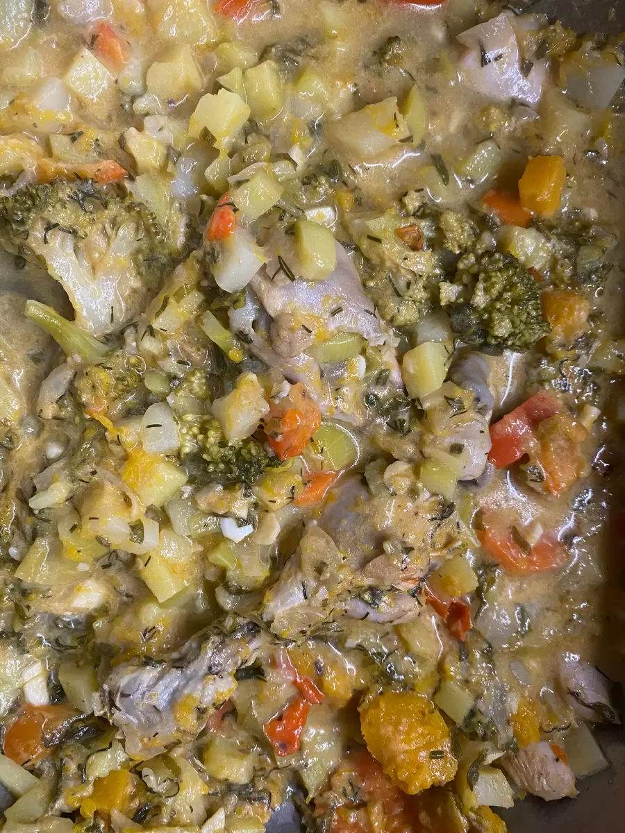 Затем пришло время добавить остальные овощи, за исключением брокколи и чеснока, которые добавили позже для большей свежести. Все оставалось аккуратно перемешивать и тушить в течение 30 минут с добавлением сметаны и воды.