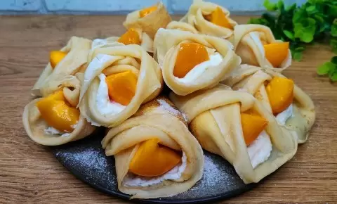 Персики нарезать мелкими дольками и выкладывать на середину блинчика ложку творожной массы и кусочек персика. Завернуть блинчик в виде конвертика или рулетика. Перед подачей посыпать сахарной пудрой — они хороши как самостоятельно, так и с вареньем или сметаной.