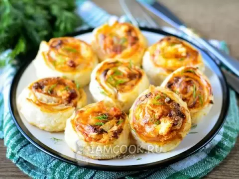 - Мини-пицца «Улитка» — идеальное сочетание слоеного теста, кетчупа и сыра с колбасой, завернутых в аппетитные спирали.