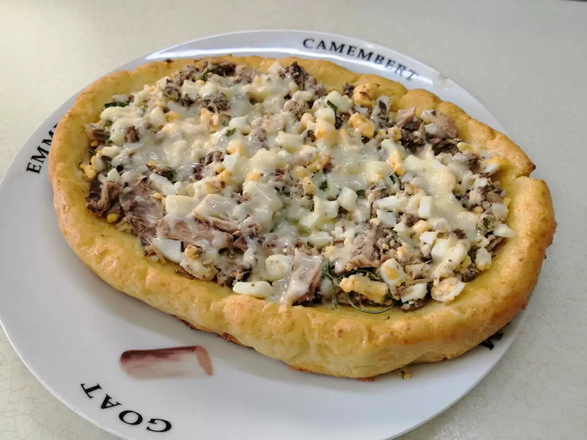 Пока основа запекается, можно подготовить начинку. Вареные яйца нарезают, тунец освобождают от крупных костей и разминают вилкой. Все ингредиенты, включая зелень, смешивают в одной миске. Сыр натирается на крупной терке и откладывается, чтобы посыпать готовое блюдо.
