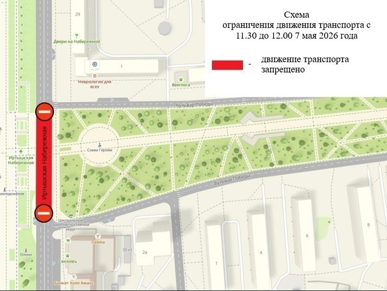 Для обеспечения безопасности участников ежегодной всероссийской патриотической акции «Zабег Победы» 7 мая с 11:30 до 12:00 будет ограничено движение транспортных средств по Иртышской набережной на участке от дома № 1 по бульвару Победы до дома № 30 по Иртышской набережной.