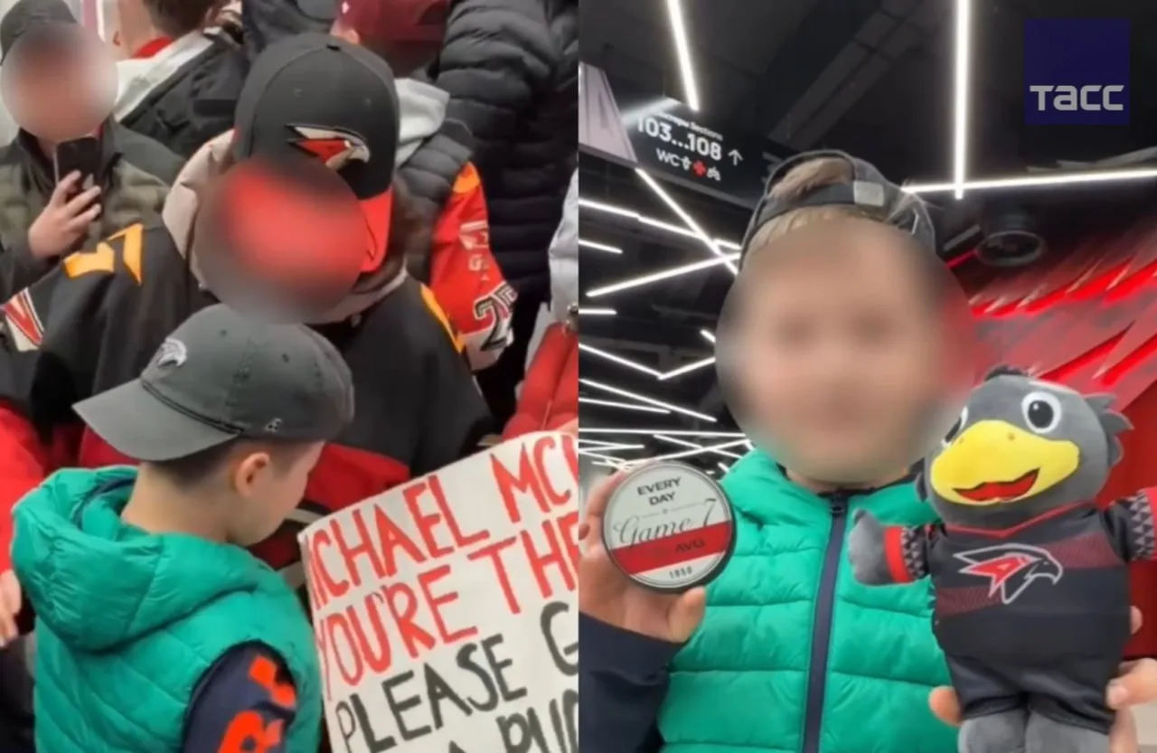 На опубликованном в соцсетях видеоролике мальчик радуется пойманной шайбе. В этот момент к нему подходит девочка с плакатом и отбирает трофей. Расстроенный болельщик не может сдержать слез.