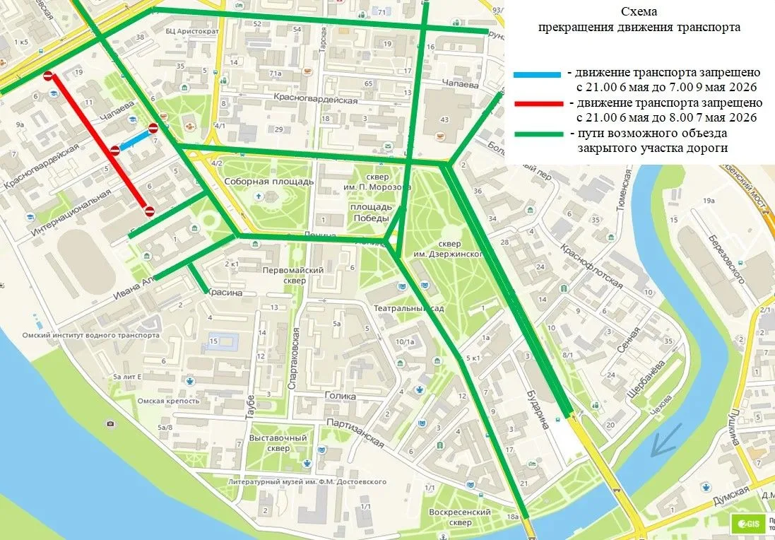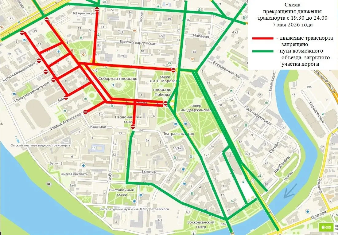 В Омске с 6 по 9 мая в центре города ограничат движение транспорта