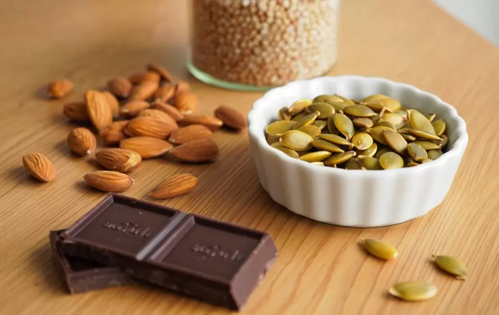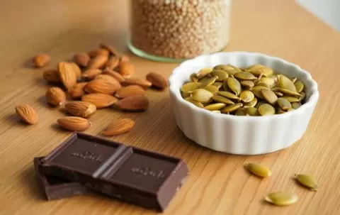 - Едой, богатой магнием, являются: тыквенные семечки, темный шоколад, орехи, бобовые и гречка;
