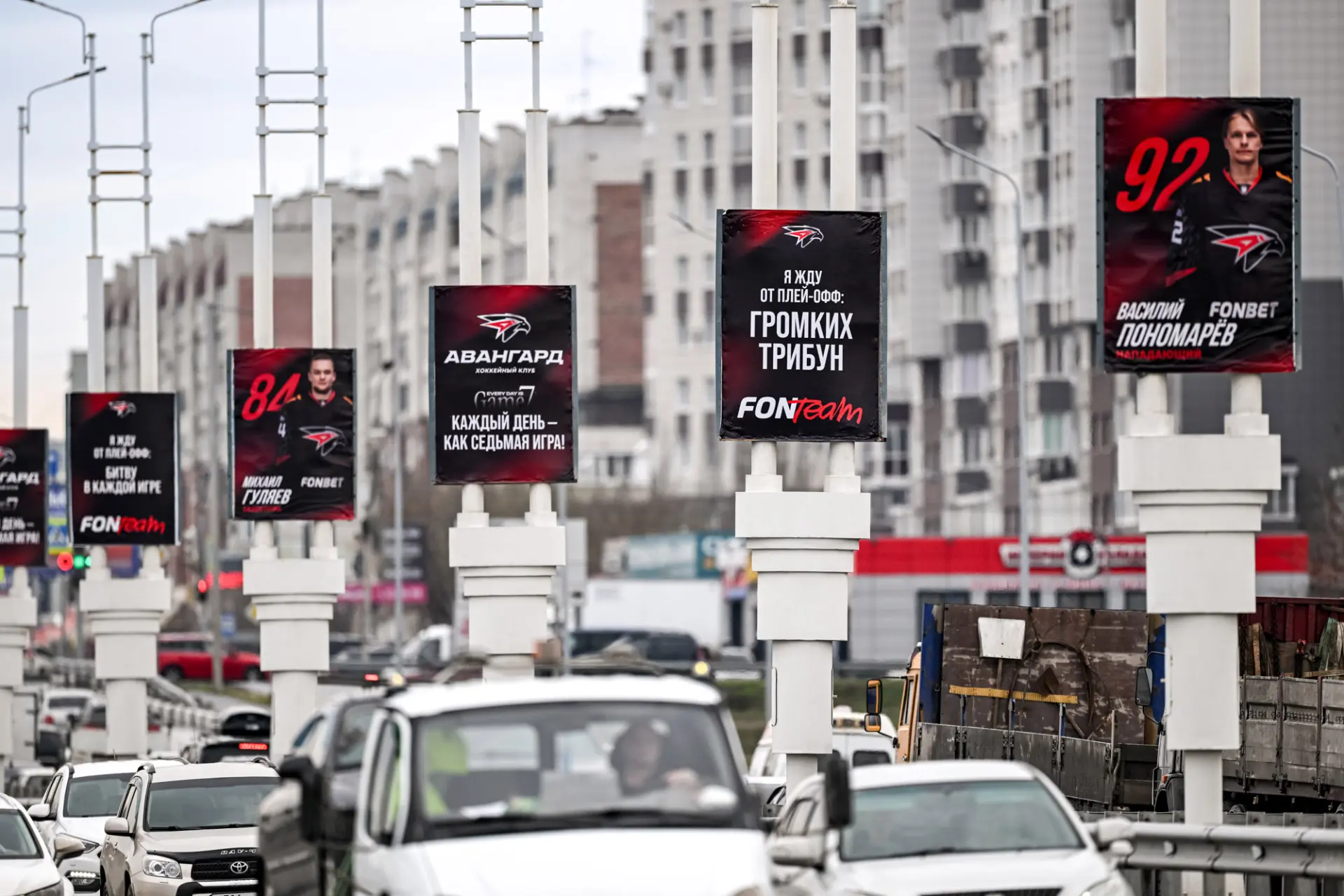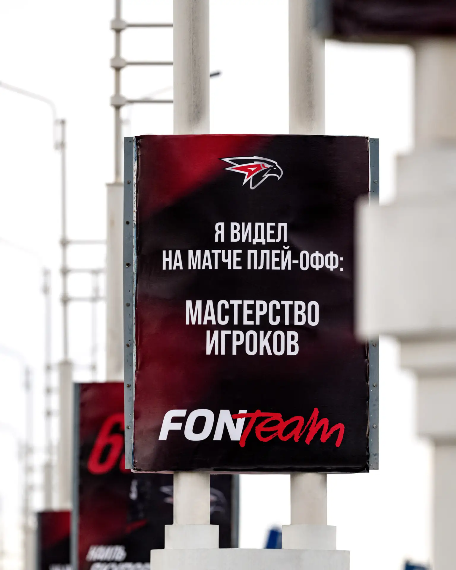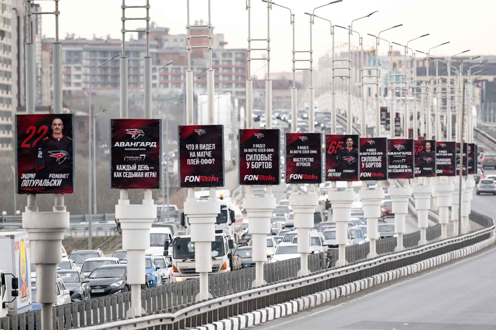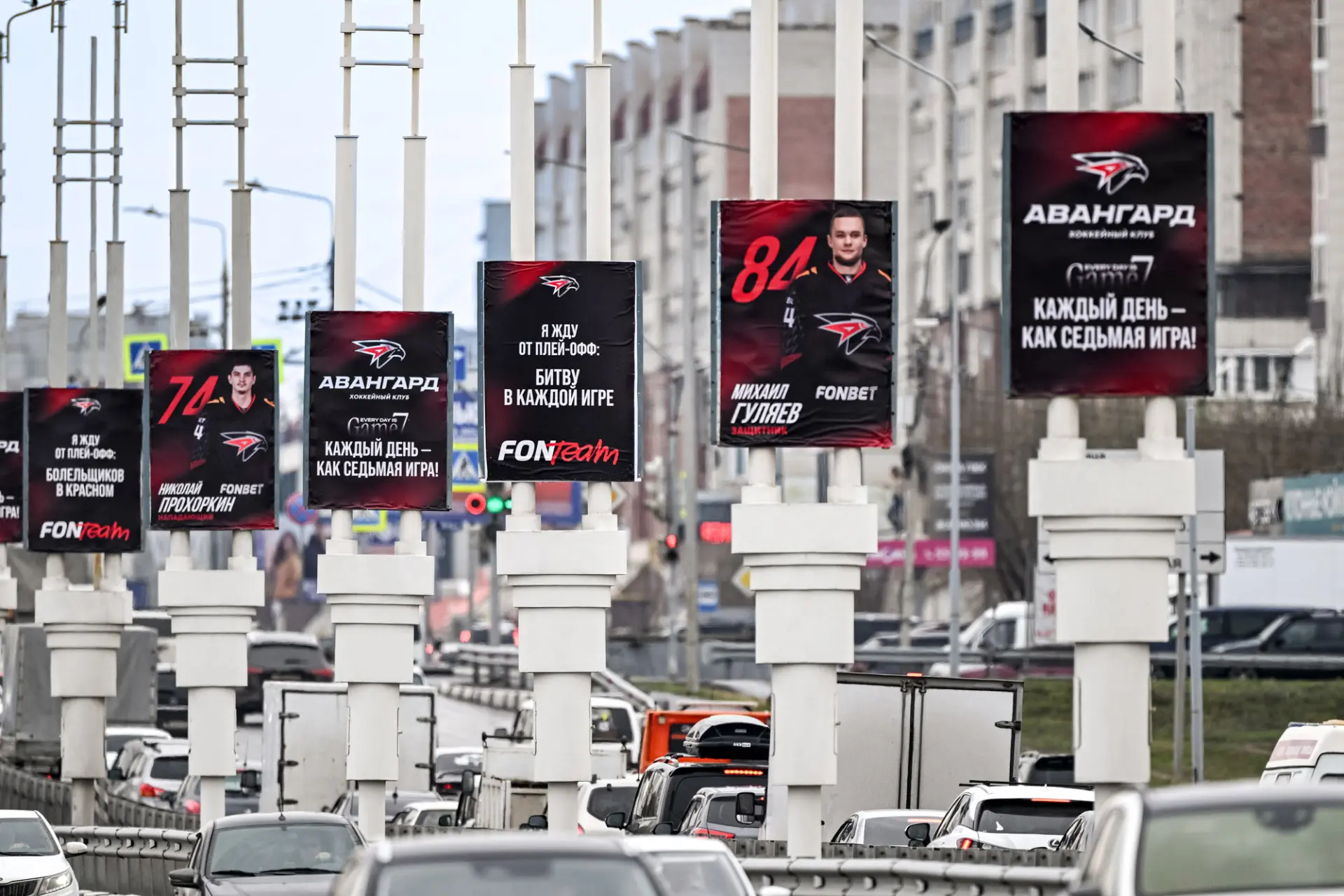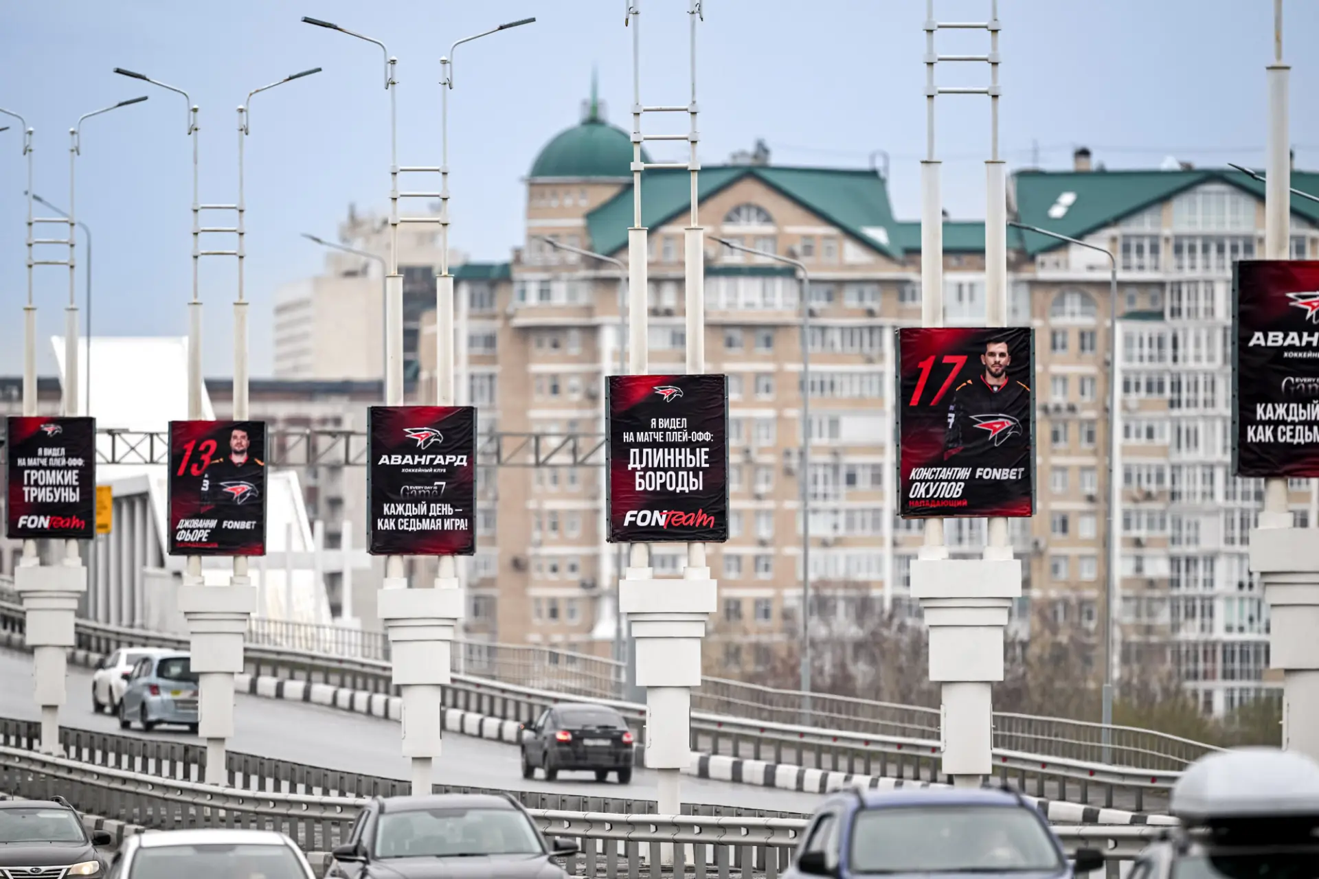 Продолжаем захватывать город На Метромосту появились баннеры в поддержку «Авангарда»: по пути на левый берег можно почитать о том, чего болельщики ждут от матча плей-офф, на правый — что видели на игре