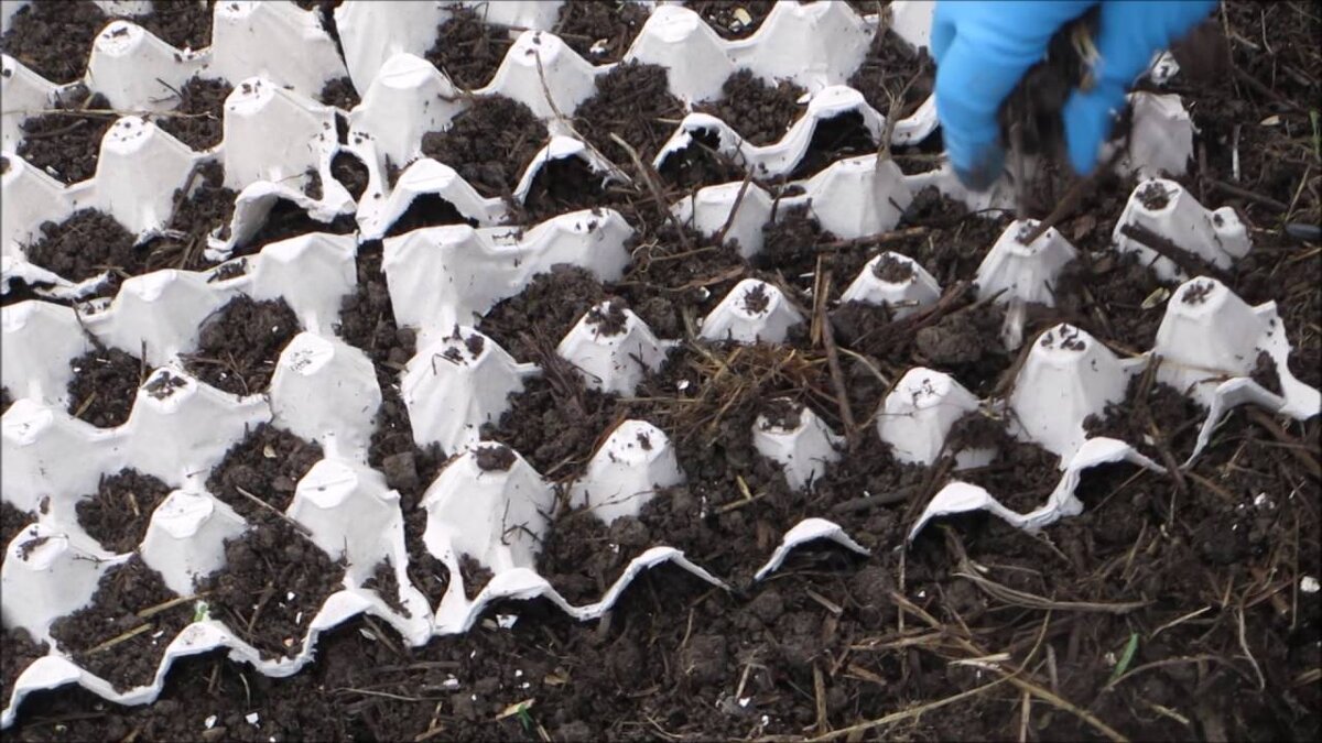 Когда семена и грядка готовы, можно переходить к самой посадке. Понадобится яичный лоток, который поможет сформировать ровные лунки. Перевернув лоток, его аккуратно прижимают к земле и убирают, в результате получая небольшие углубления глубиной около 2 см. Это идеальное расстояние между лунками позволит избежать загущенности посевов.