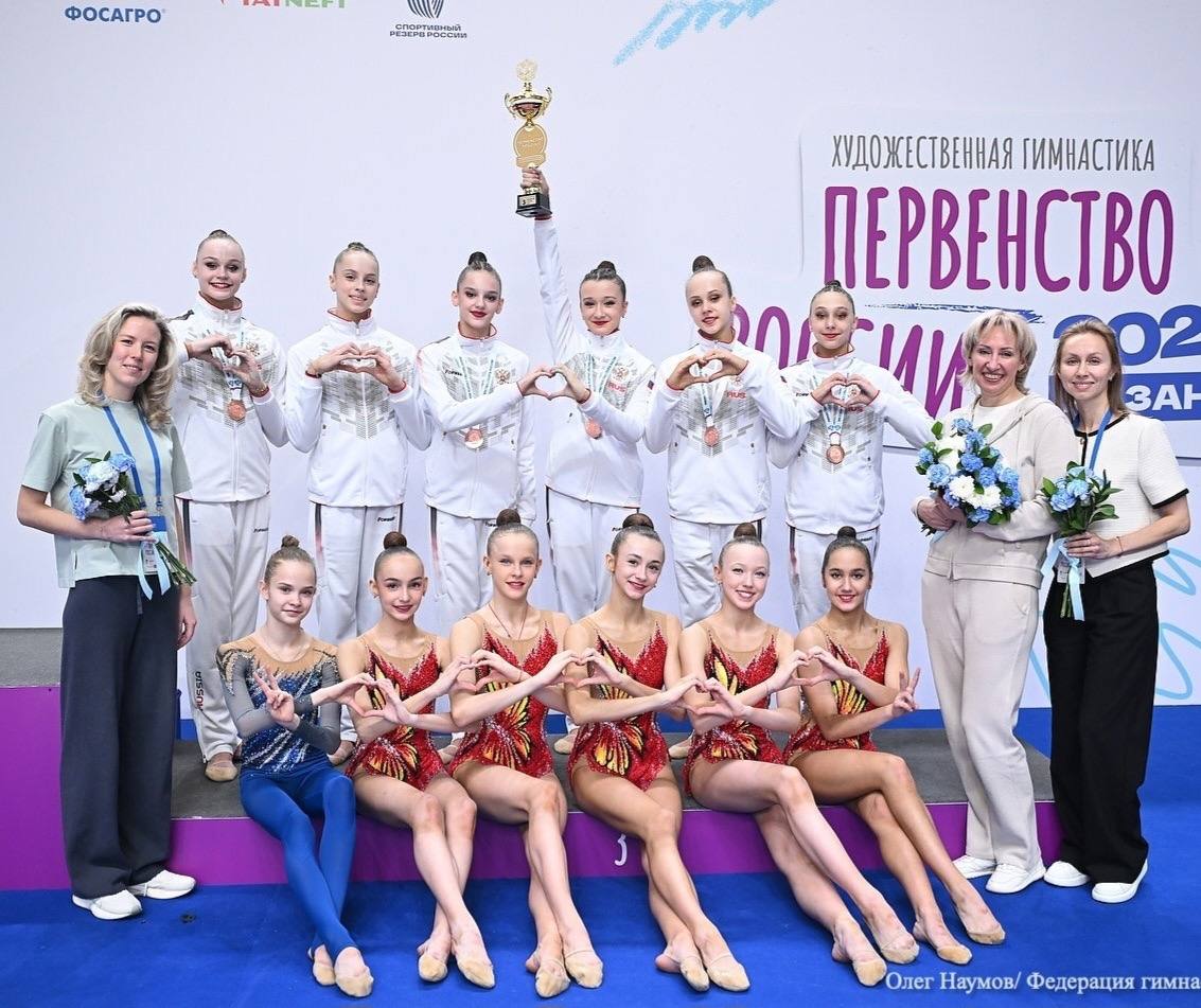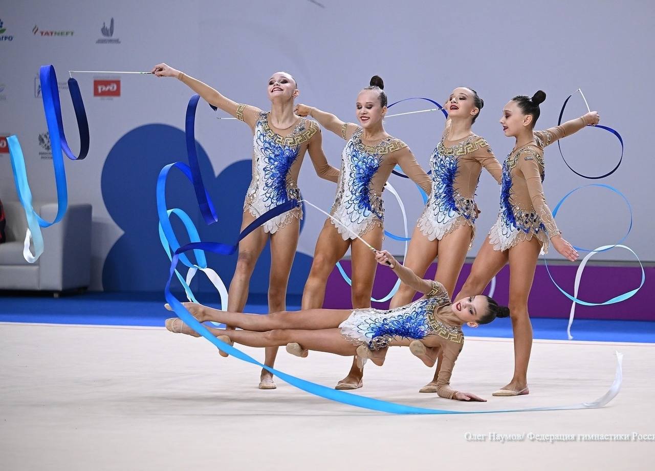 Групповички Екатерина Иванищева, Сабина Кузьмина, Варвара Масленникова, Полина Маслова, Вероника Романова и Юлия Севостьянова взяли «серебро» многоборья и «бронзу» по итогам упражнения с 5 лентами.